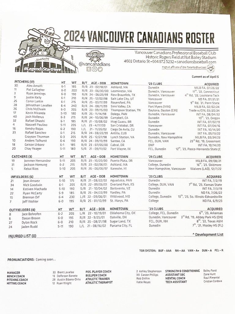 The New Hampshire 2024 roster features 27 former Vancouver Canadians and there is one former C’s player on the Dunedin roster in 2021 utility man Sebastian Espino. The 23-year-old Dominican is making a conversion to the mound as a righthander. Espino hit .295 for the C’s during their Hillsboro exile when the pandemic closed the U.S./Canada border. He was named a 2021 MiLB.com Blue Jays Organizational All-Star but he struggled with the bat over the last two years with New Hampshire.
