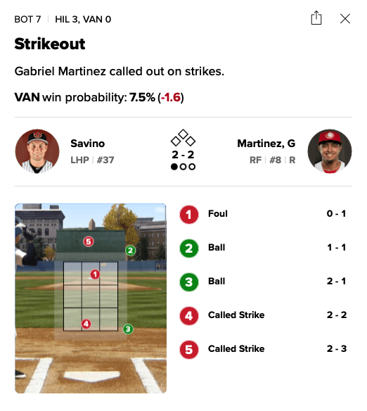 Micheletti was robbed of a hit by Waldschmidt who made a leaping catch in left field to start the bottom of the seventh. Martinez then struck out looking on a 2-2 pitch that was way above the Trackman strike zone.